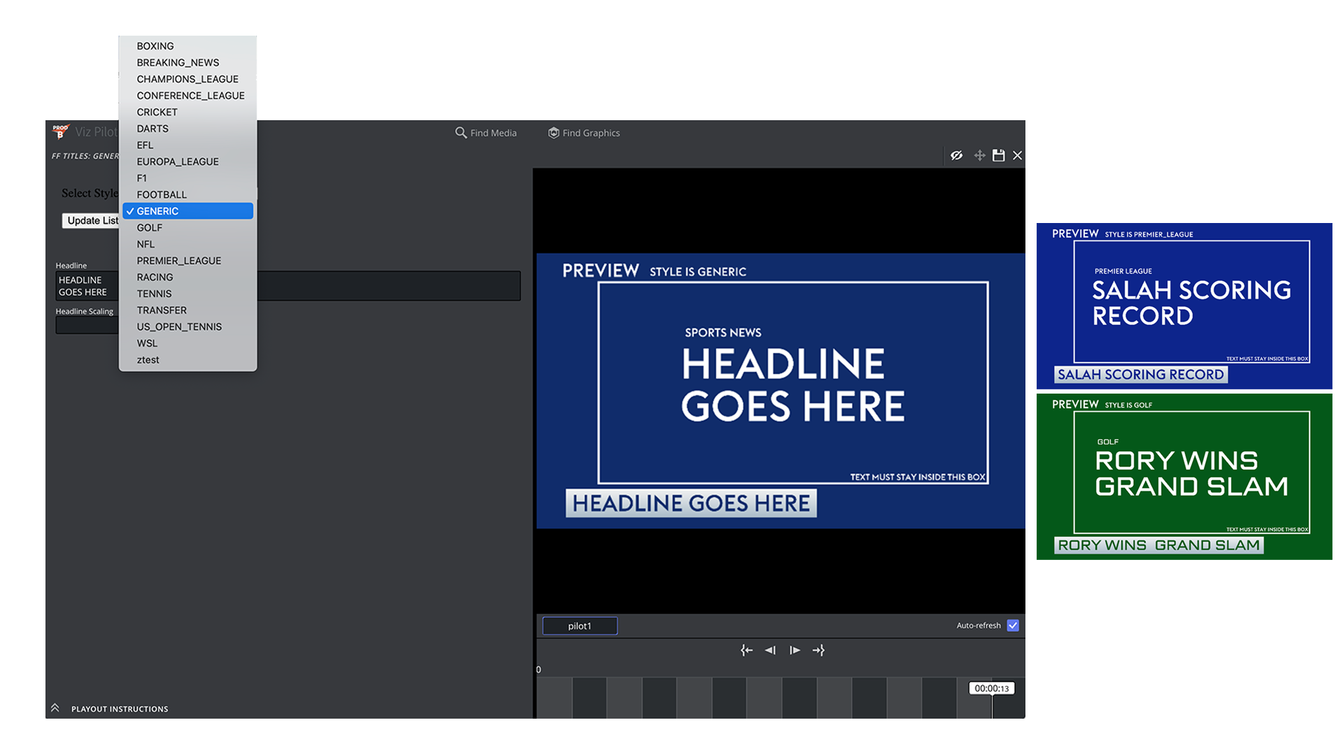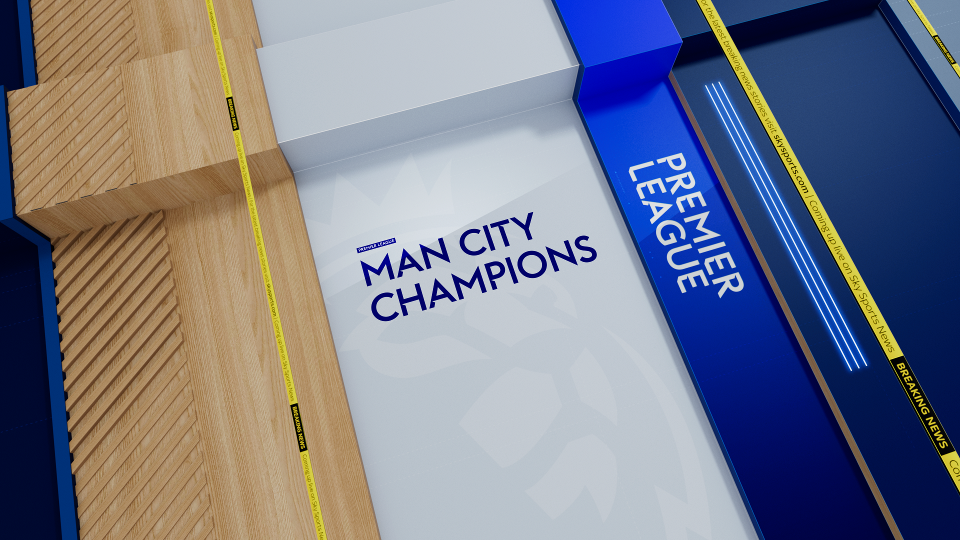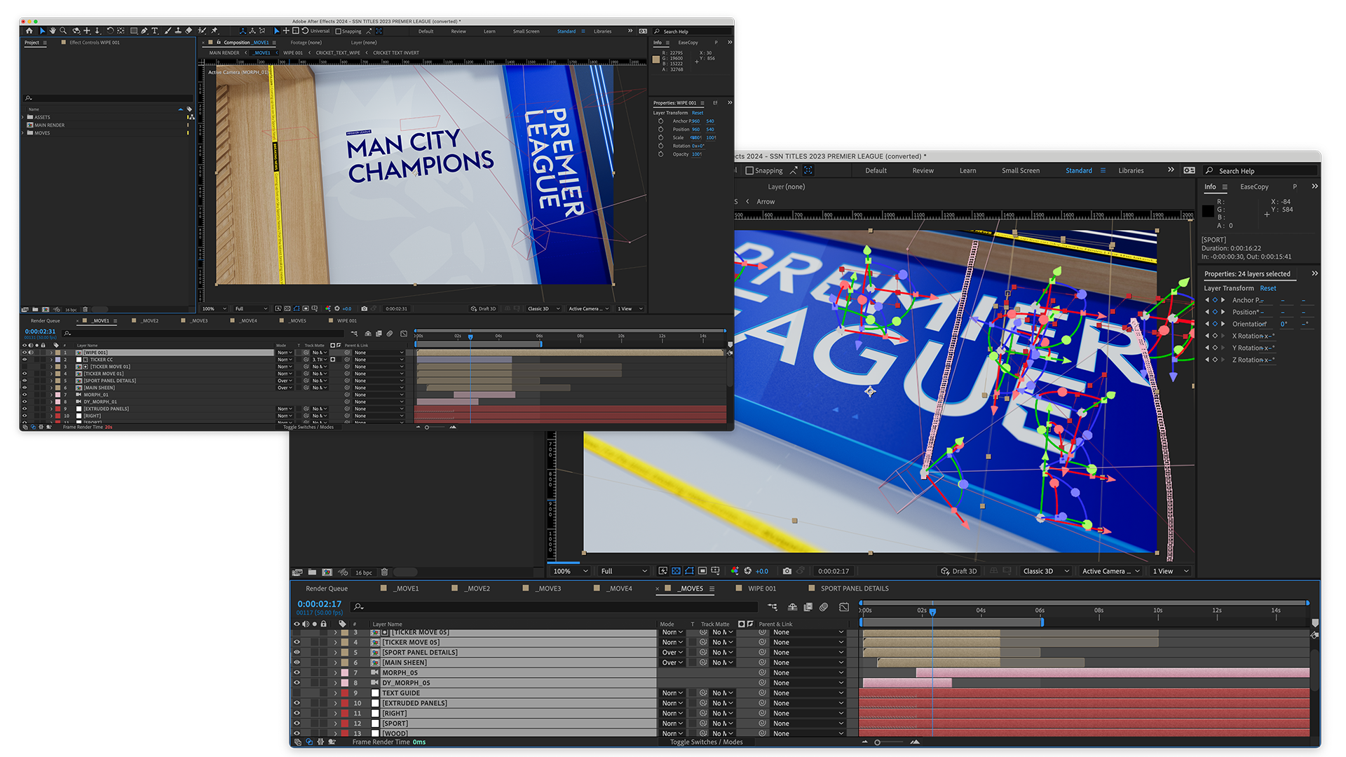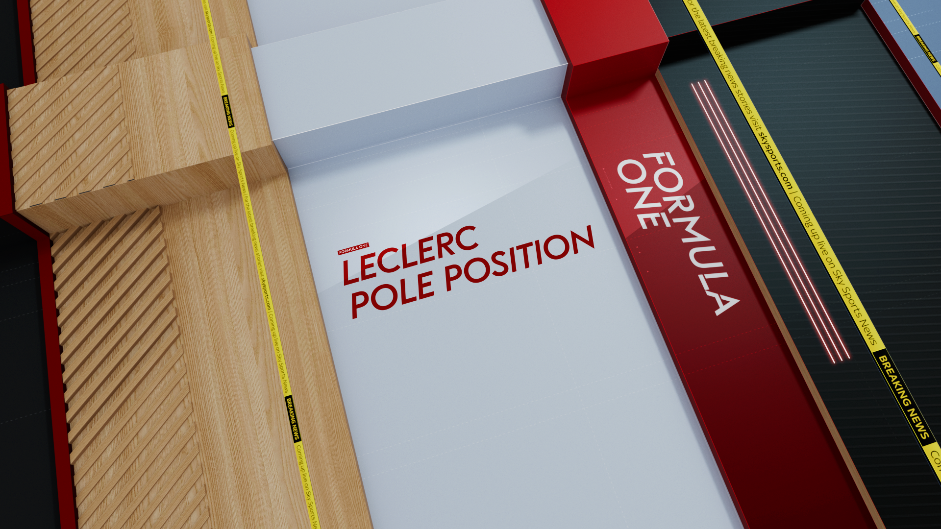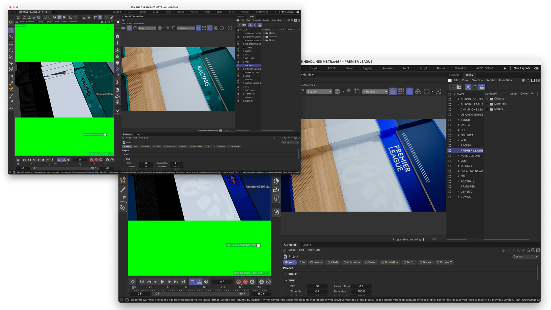 Using Photoshop, a design and colour scheme were created for each sport. Those visuals were imported into Cinema 4D as textures. Using C4D’s Take System, we enabled easy switching between sports within one project. In After Effects, we added animated motion elements and created tracking points for the headline text. These were then replicated in Vizrt, allowing real-time text integration over the rendered visuals - delivering a flexible, automated opener that updates based on sport and headline.