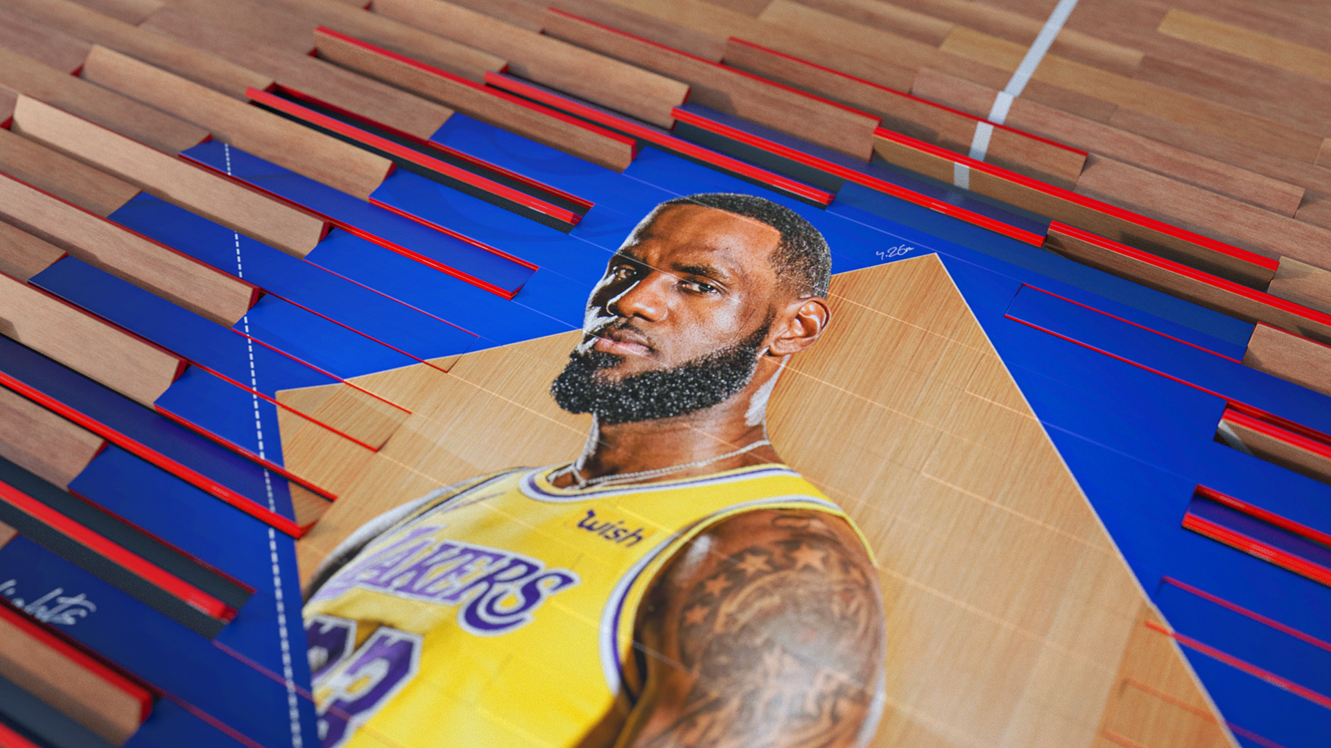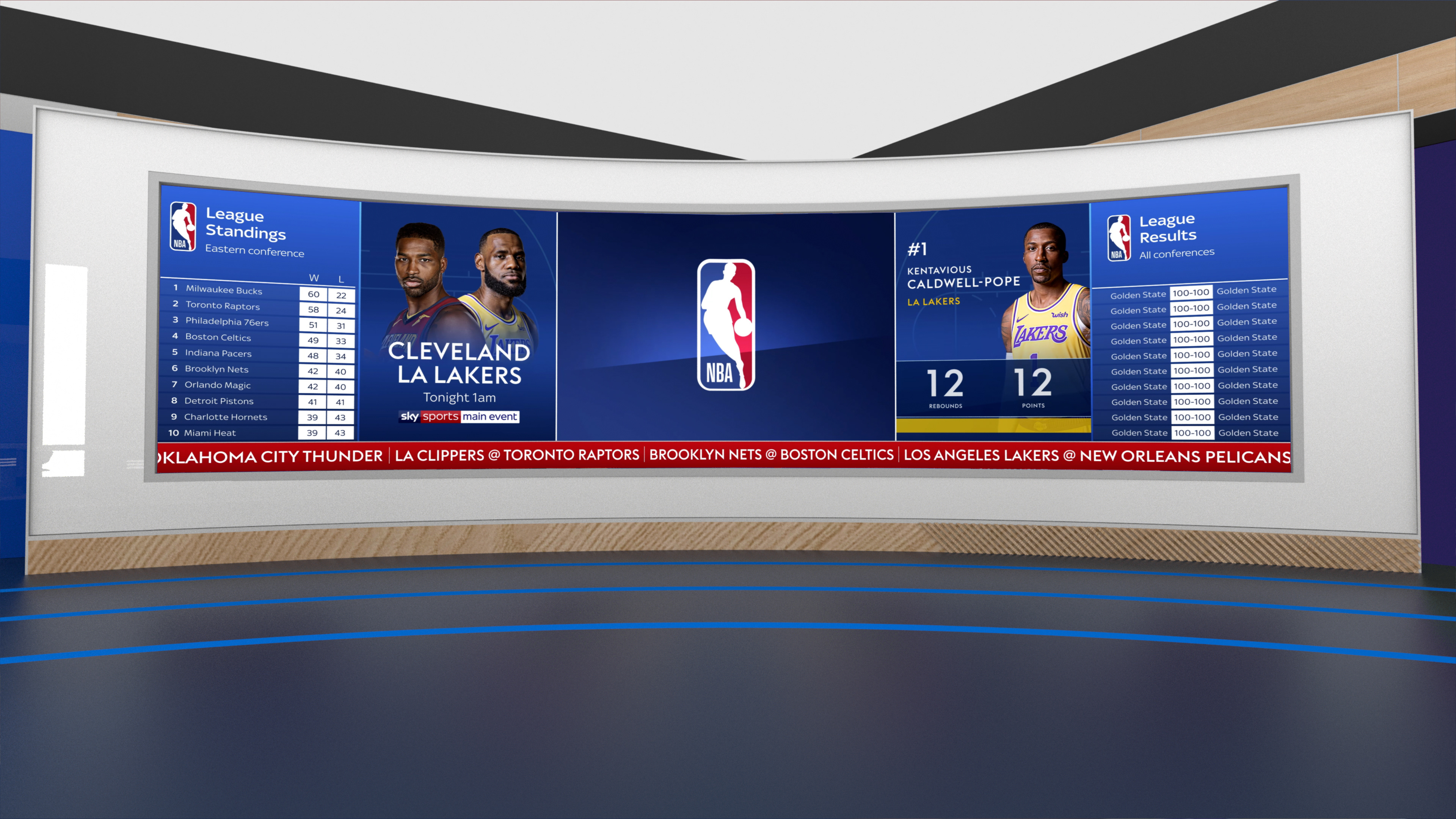 The foundation for all Sky Sports NBA graphics began with this concept for NBA Centre. We designed a 3D basketball court where rotating floorboards revealed the NBA logo and seamlessly transitioned into a Vizrt-powered interface. This updateable graphic displayed live tables, a rolling news ticker, fixtures, and player stats - which ended up setting the tone for future NBA visuals on the channel.