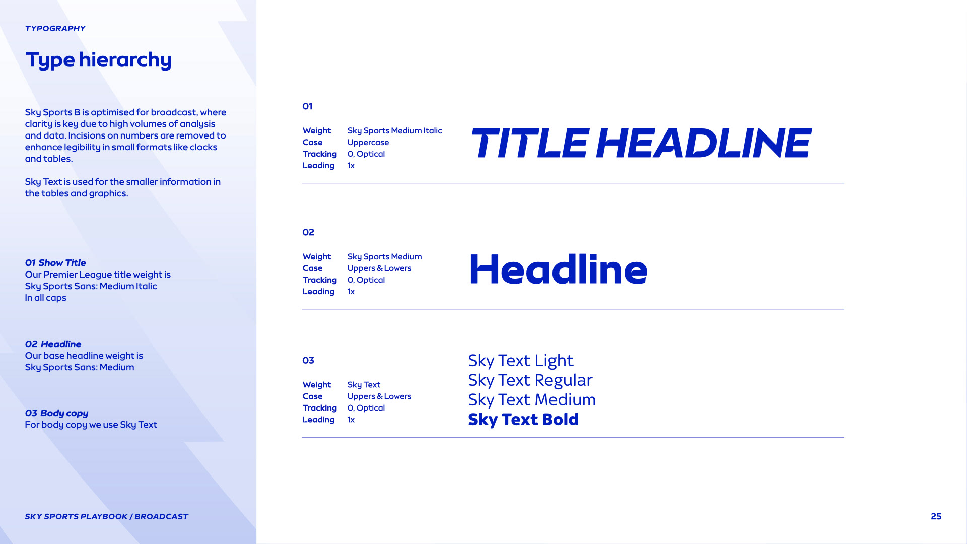 A clear type hierarchy was established - body copy and headlines remained consistent across sports, while weights could be adjusted for title headlines to give each sport its own character.